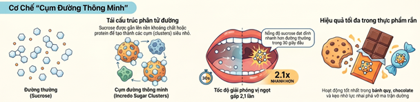 Dựa trên nguyên lý tạo cụm (clustering) để tăng diện tích bề mặt tiếp xúc và tốc độ giải phóng sucrose. Trong 30 giây đầu, nồng độ sucrose tự do của Incredo Sugar cao gấp 2,1 lần so với đường tinh thể cùng kích thước. Sau 2 phút, nồng độ cân bằng tương đương. Sự chênh lệch đỉnh sớm này chính là yếu tố tạo cảm giác "ngọt hơn" với cùng khối lượng đường.