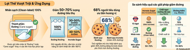 Hình ảnh mô phỏng lại từ các thông tin của Incredo LTD. Incredo Sugar Whitepaper: Technical & Sensory Data. 2025. Vui lòng tìm hiểu thông tin chính xác tại www.incredo.com